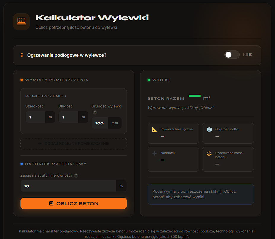 Intuicyjny interfejs użytkownika – proste pola do wpisania długości, szerokości i grubości wylewki